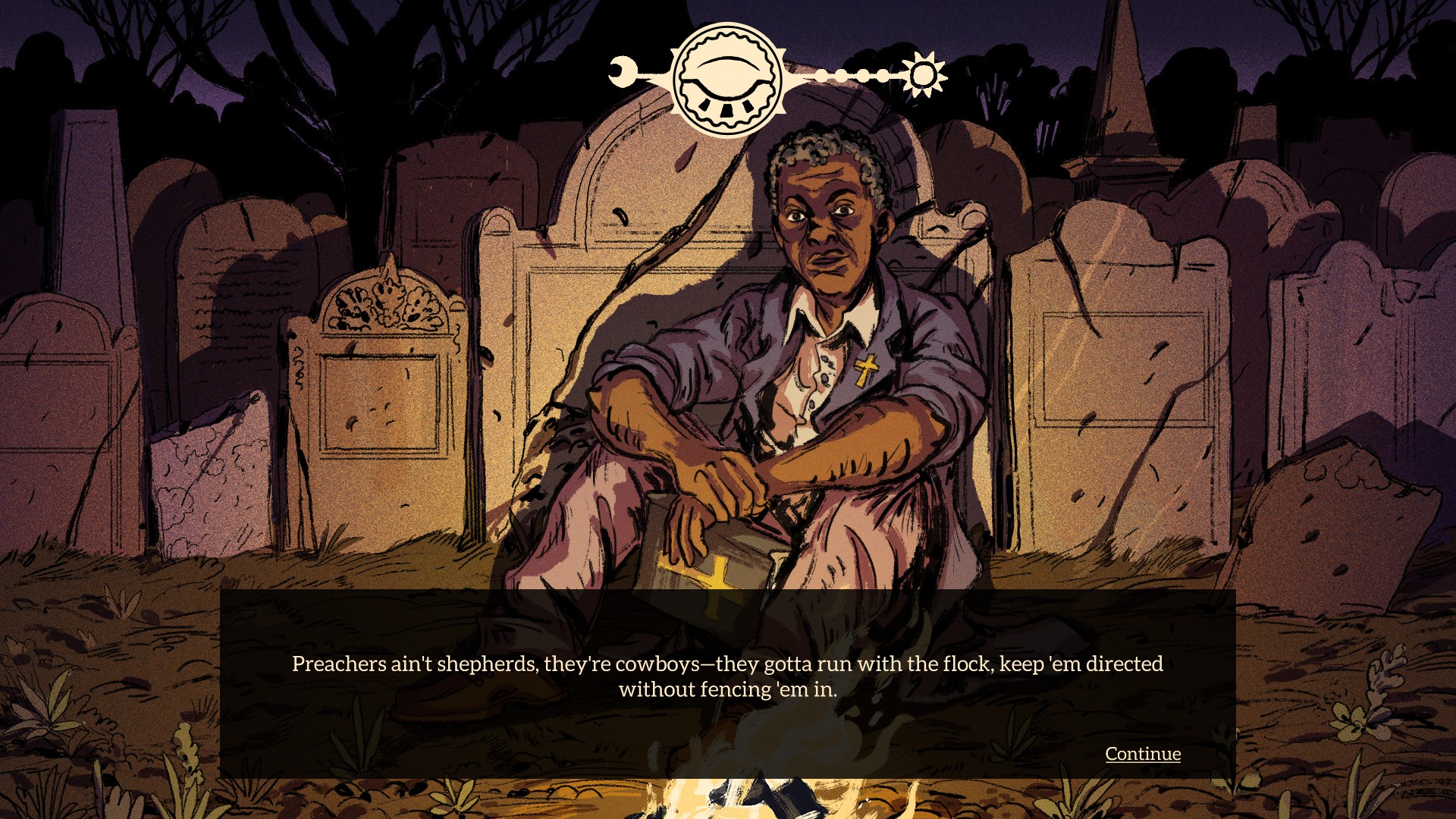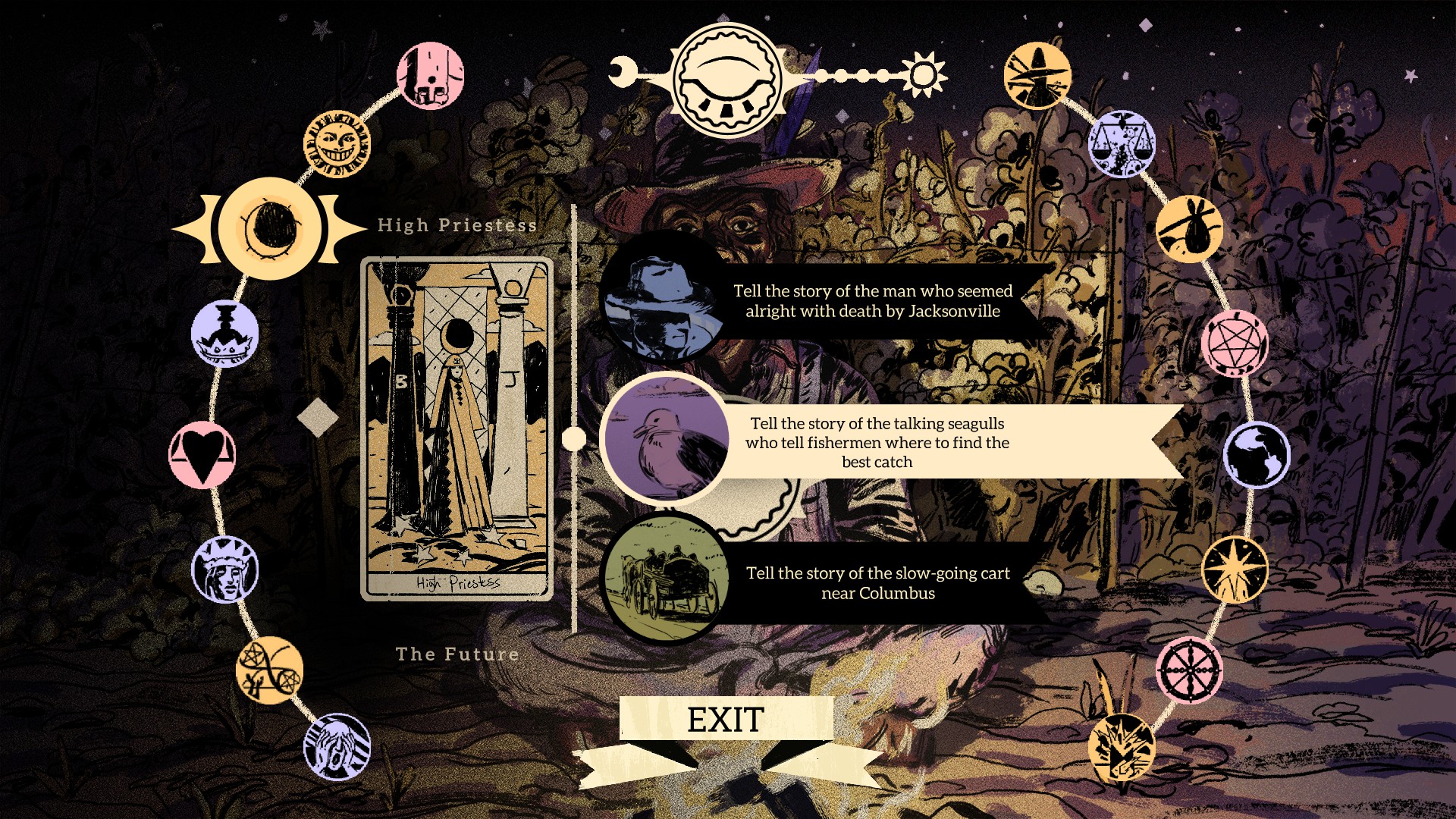 Спершу наш герой просто бродить по карті США і збирає правдиві, “сирі” історії, що лягають у його інвентар у вигляді карт, схожих на карти таро. Всі історії чудово озвучені і всі дуже різні. Не всі однаково хороші. Деякі одразу просяться лягти в основу цілої книжки чи фільму. Демонічний козел між спаленим будинком і кришталево чистим озером – це просто готова затравка для Гільєрмо дель Торо або Тіма Бартона. Інші оповідки спершу здаються абсолютно буденними – як-от історія про двох жінок, заарештованих за контрабанду, однак згодом їхня цінність розкривається повніше. Буквально десяток з понад 250 історій я просто не зрозумів – не через незнання англійської (англійська мені як друга рідна) а через нерозуміння, що такого в принципі відбулося в описаній ситуації.