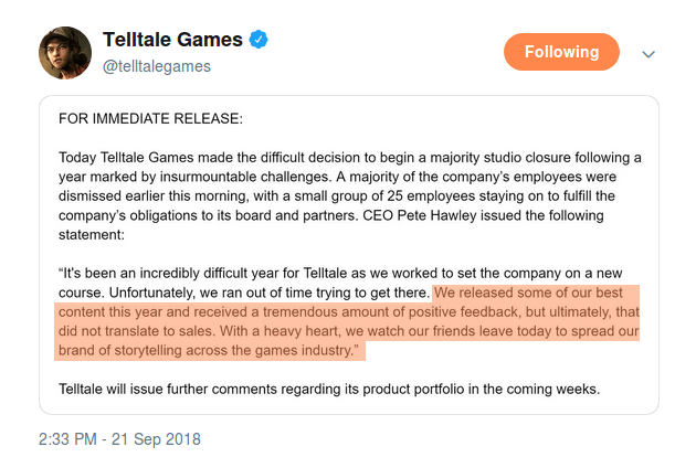 В опублікованому твіті про закриття TellTale Games, Піт Хоулі стверджує, що популярність і хороше ставлення гравців до їхніх ігор не конвертувались у продажі, тобто компанія закривається через брак коштів.