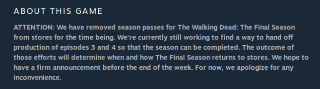 “Увага! Ми поки що зняли з продажу сезонні пропуски “The Walking Dead: The Final Season”. На даний час, ми все ще працюємо над пошуком можливостей передати розробку 3 і 4 епізодів, щоб завершити сезон. Саме результат цих пошуків і зможе визначити, коли і як Фінальний сезон знову повернеться до магазинів. Сподіваємось, що зможемо зробити більш визначене оголошення з цього приводу до кінця тижня. На зараз, ми вибачаємося за усі незручності.”