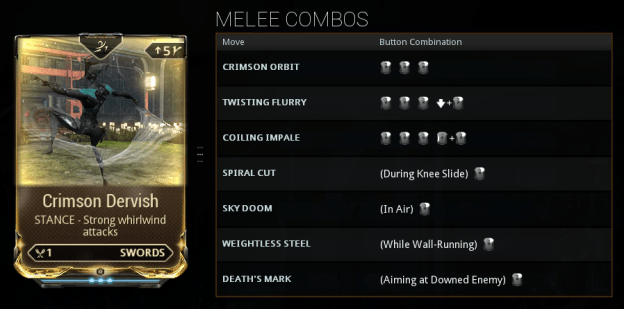 Другий аспект – бій. Володіння холодною зброєю у Warframe – чарівна пісня. У будь-яку холодну зброю вставляється підходящий для неї “модифікатор стилю”. Стиль має прописані в ньому удари і комбо. Наприклад, “Crimson Delvish” до функціоналу “просто меча” додає широкі махові удари з рухом вперед, ефективні і видовищні.