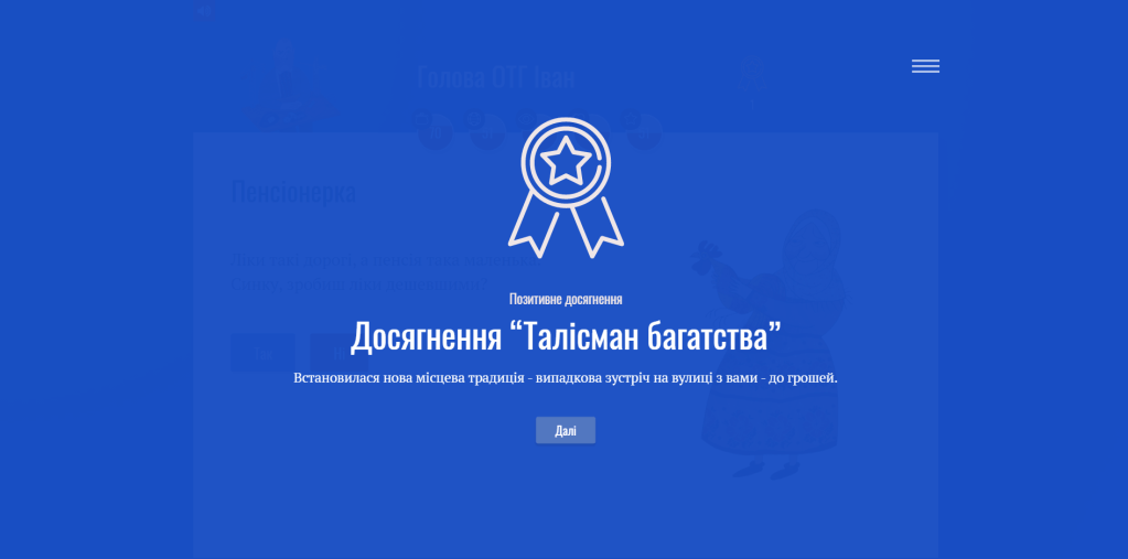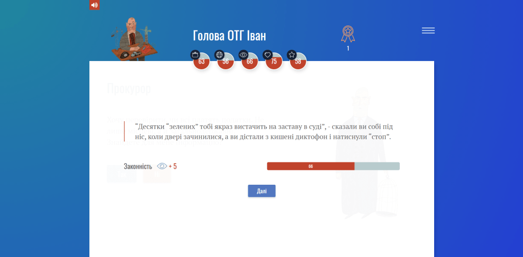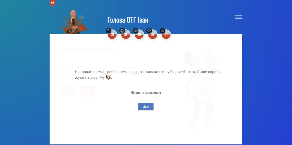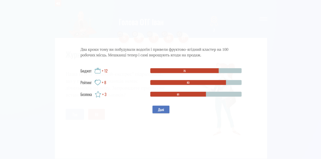 Не будучи дитячою, гра є простою для сприйняття. Це короткий і ненапряжний досвід, який проте добряче збагатить ваше розуміння українського самоврядування.