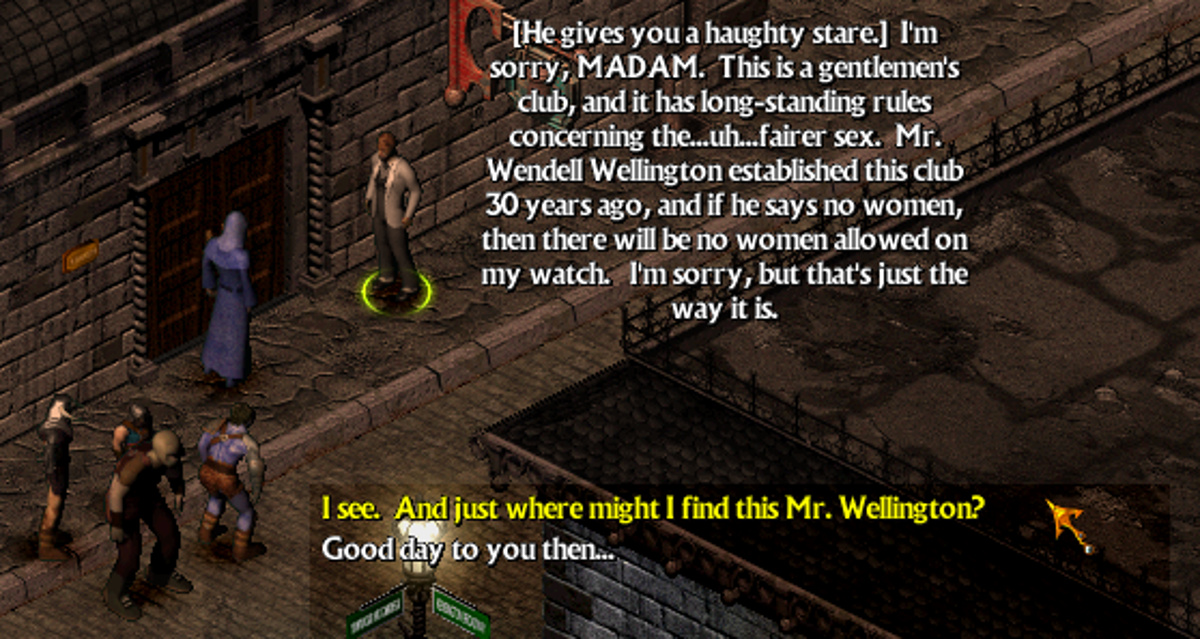 “Пробачте, ПАНІ. Це джентльменський клуб, і у нього є давні традиції щодо… ем… прекрасної статі”. Скріншот Lilura1