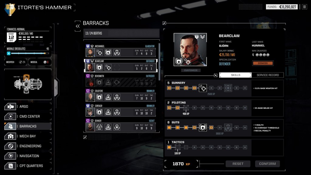 Важливо згадати про пілотів. Вони у боях отримують досвід. Цей досвід ми вкладаємо у чотири гілки розвитку, в яких можна вивчити три – лише три! – унікальні вміння, активні та пасивні здібності для ваших Мехів.