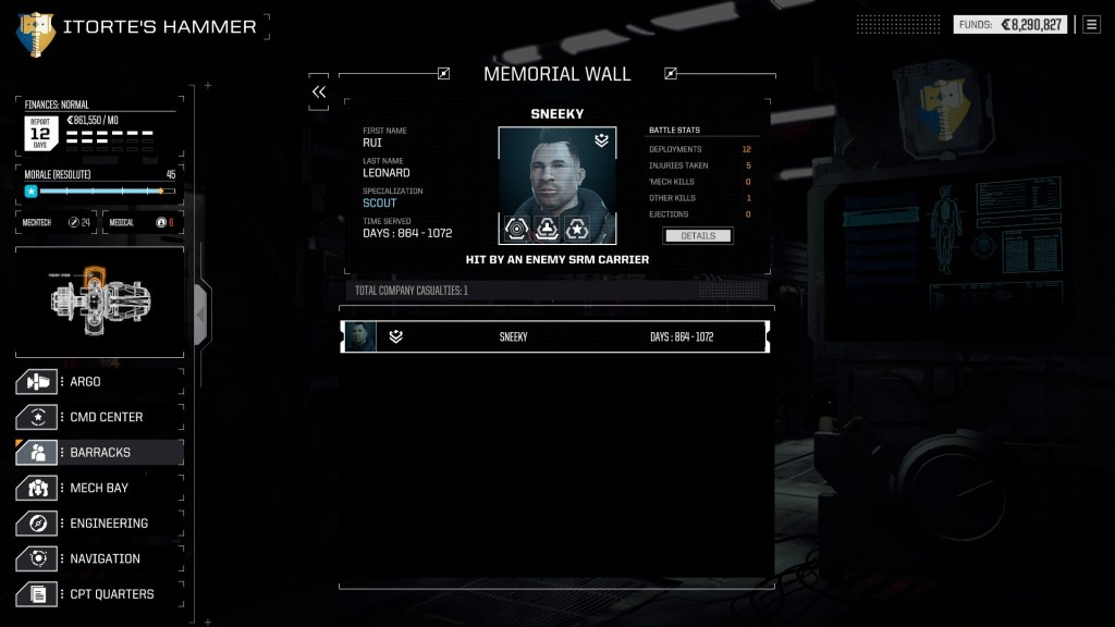 Відвідування “меморіальної стіни” – це сумно, нехай досі у мене загинув лише нещасний Sneeky. Я пам’ятаю, як я наймав його, як він воював і як знайшов свою смерть у бою.