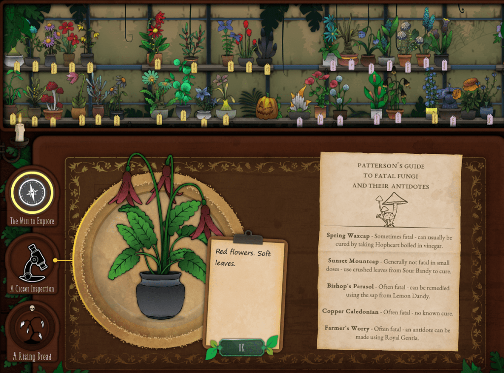 Копання в енциклопедії набагато цікавіше, ніж може здаватися в реальному житті. Strange Horticulture робить ботаніку справді захопливим заняттям. Рослини (не лише квіти, але і гриби, в’юни та деякі інші речі, які складно описати) у цій грі всі вигадані, однак тонкощі їхніх описів спонукали мене і в реальному житті звертати більше уваги на форму листя, забарвлення і запахи різних квіток.