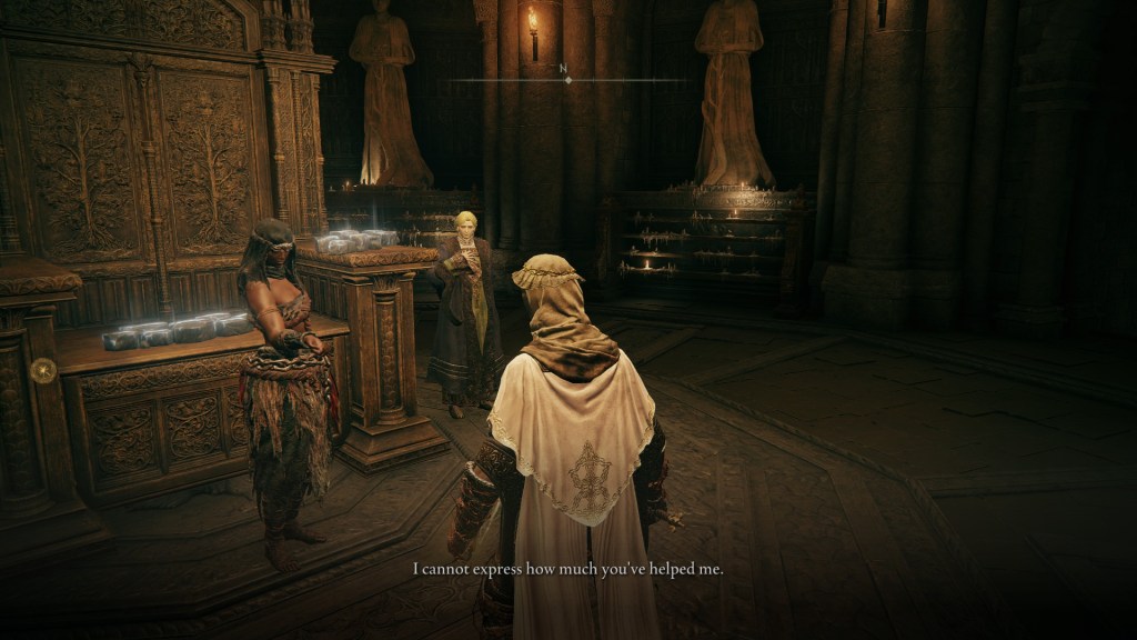 В Elden Ring присутня подібна динаміка, але її повторювана відмінність: вам говорять одразу, що ви обираєте поганий шлях, який суперечить Вищій Волі. Друга часта відмінність: згодом, коли відкривається нагода, ви вирізаєте тих, на чию користь нещодавно взялися порушувати правила. З деякими варіаціями це відбувається із завданнями Білої Маски Варре, у Вулканічному Маєтку, у сюжетній лінії Пожирача Фекалій та в роботі на відьму Ранні.