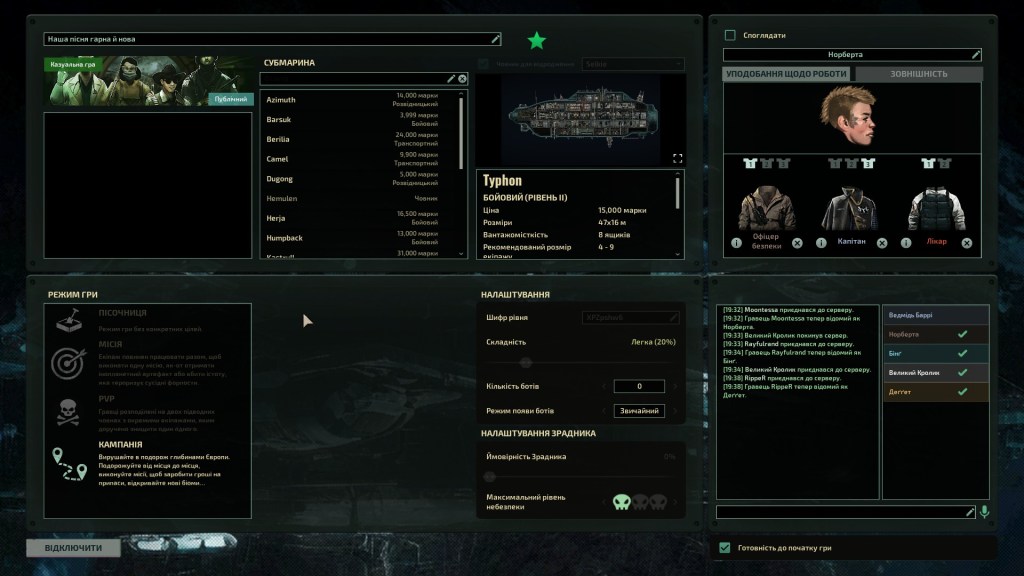Субмарина – ще один ключовий аспект в “Баротравмі”. Гра пропонує близько півтора десятка готових підводних човнів, а також редактор, де можна зробити свій і зберегти його у вигляді модифікації. Самі човни різняться за розміром і призначенням, тож можна обрати собі судно, що пристосоване до того типу місій, які вам найбільше до смаку. До субмарин можна докуповувати різні типи гармат і покращення, але фінальної форми досягнуть лише субмарини найвищого рівня. Проблема, з якою тут зіткнувся наш екіпаж: судна найвищого рівня також дуже великі, й наша команда з 5-и з побоюванням дивиться на цих велетнів, розрахованих на 20-30 моряків. Але чим просунутіший підводний човен, тим глибше ви можете в ньому заплисти, тим важчі місії виконувати й, відповідно, заробляти найбільше грошей, щоб покращувати човен. На початку ваш бюджет дозволятиме обрати лише з кількох дешевих базових корабликів, а на решту потрібно буде заробити. У механіків також є талант, який дозволяє максимально покращувати і човни нижчого рівня, що виглядає ймовірним розвитком для нашого невеликого екіпажу.