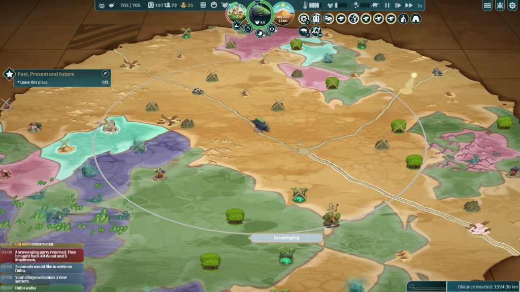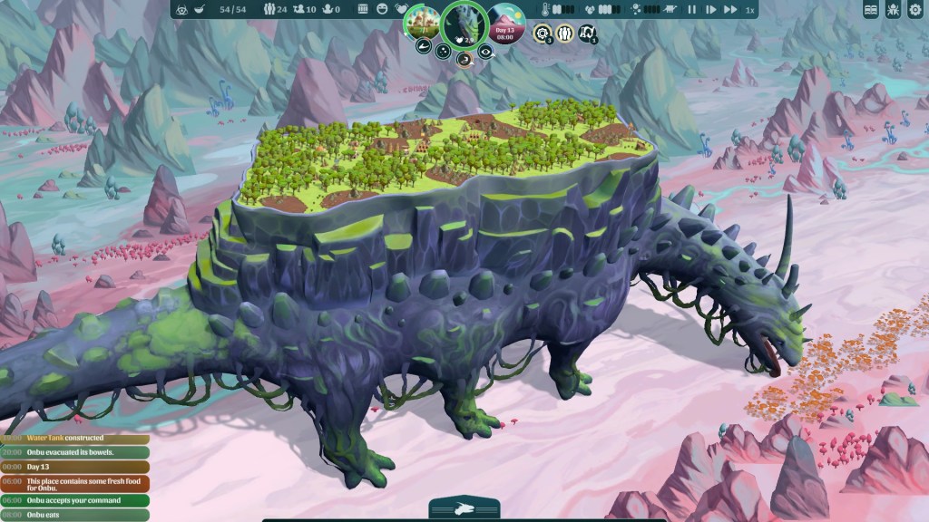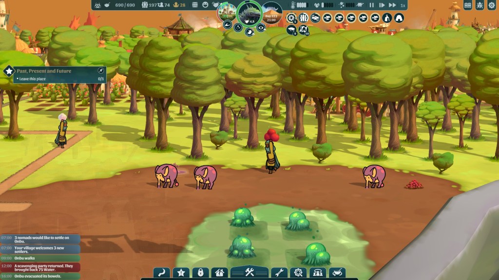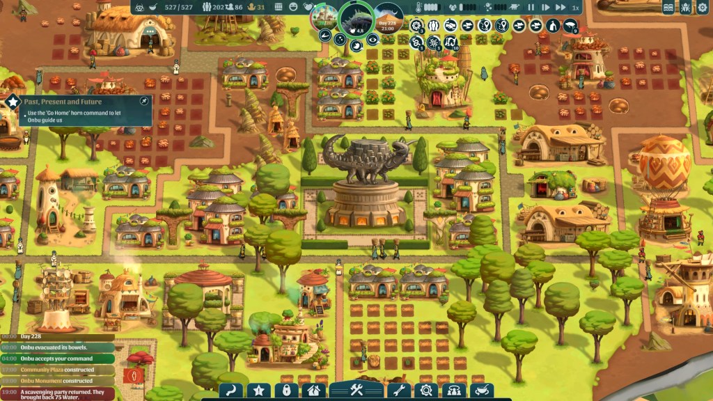 Взаємодія з Онбу – окрема гілка розвитку вашого поселення. Серед іншого, вона дозволяє обирати на великій карті шлях, яким рухатиметься шестилапий гігант. Вибір шляху, своєю чергою, дає змогу збирати ті чи інші рідкісні ресурси у світі – вибір локацій для дослідження нагадує звичну схему Frostpunk, от тільки наше поселення постійно рухається і карта змінюється. Ваші розвідники вирушають до обраних локацій на дельтапланах і згодом повертаються назад… якщо не трапиться ніякого нещасного випадку.