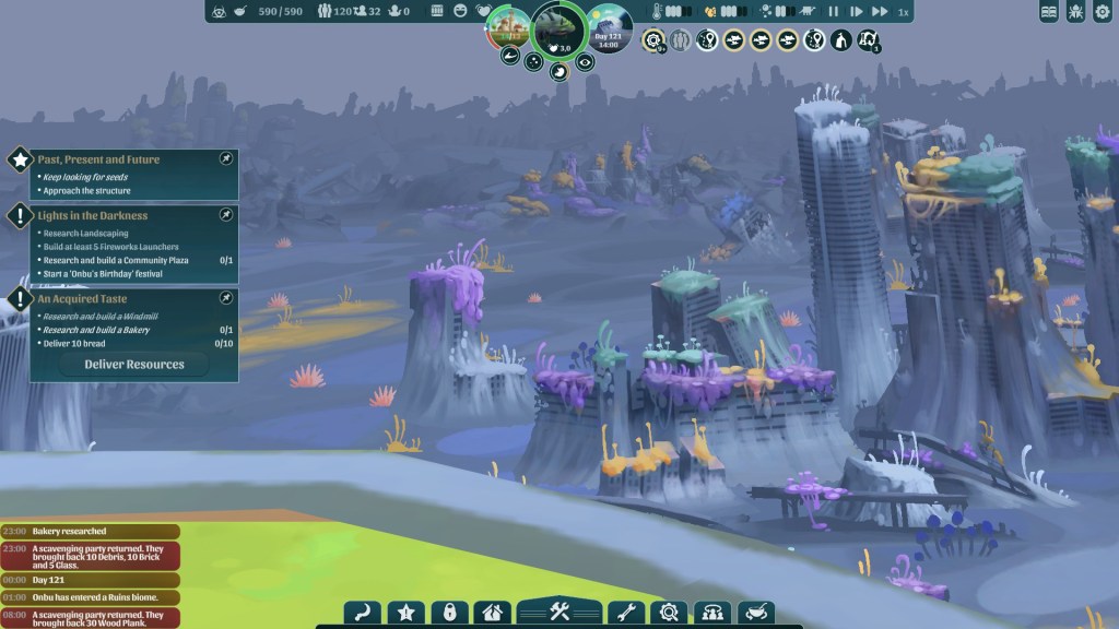 Перехід з одного регіону в інший відчувається досить сильно. Коли Онбу покидає джунгі і опиняється в пустелі, краще перемкнути ваші ферми з буряків на кукурудзу. І перед тим варто запастися водою! Похід через руїни міста демонструє незавидну долю людства: Онбу крокує широкими магістралями посеред висотних наукових та торговельних центрів, але усе воно виглядає занедбаним, з’їденим грибком і не підлягає відновленню – це особливо токсичне середовище і дехто з ваших поселенців можуть не пережити цю подорож.
