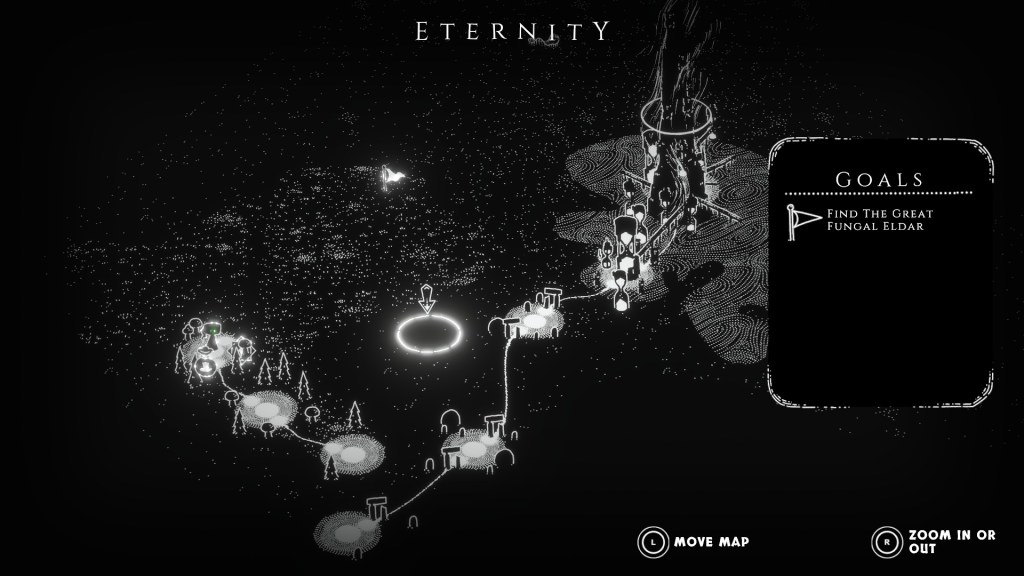 Тутешнє потойбіччя не схоже ані на пекло Данте, ані на будь-яку версію раю. На карті воно називається “Вічність” – ні багато, ні мало. Це загублені і заплутані землі у пітьмі, в яку краще надовго не забрідати – бо можна не повернутися. Однак не все так погано – тут є і приязні духи, і купа різних міні-ігор, і по-справжньому чарівні краєвиди. Зрештою, із пітьми добре видно зорі, які мандрівна душа має розшукати. Збирання зірок у сузір’я важливе і для власного підсилення, і для просування потойбічним світом, і для відновлення своїх спогадів з життя до смерті.
